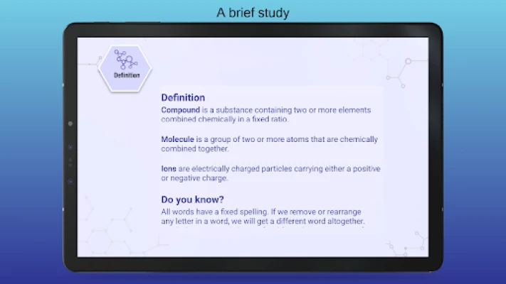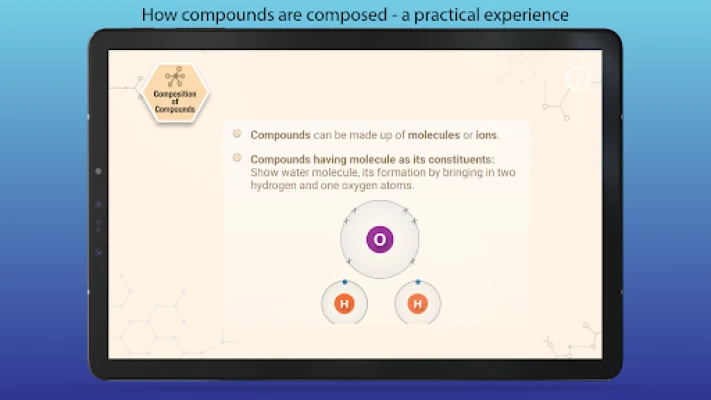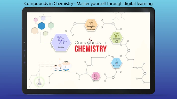Compounds in Chemistry is a K12 educational app designed to help students understand the composition and ratios of chemical compounds through an interactive learning approach. The app covers the basics of compounds, molecules, and ions using engaging 3D animation-based experiments. It also explains the electrolysis decomposition process in a virtual experiment format. The interface is designed to support easy navigation and hands-on practice with science concepts through interactive visuals.