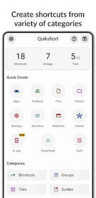 Create shortcuts and tiles from variety of categories such as - Apps - Activities - Contacts - Files - Folders - Websites - Settings - System Intents - Custom Intents