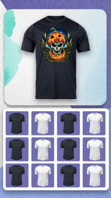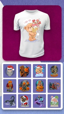 The t-shirt design maker app is very easy to use with tons of Art, Colors, and Textures. The t-shirt design studio includes a huge collection of categorized Art(Stickers), Graphic Elements, Shapes, Textures, and shirts with an evil cat.