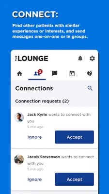 • CONNECT: Find other patients with similar experiences or interests, and send messages one-on-one or in groups.