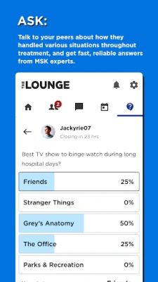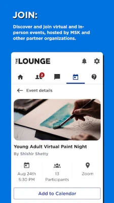 Welcome to The Lounge at MSK! The Lounge is a safe and protected social network app for teen and young adult patients (ages 18-39) at Memorial Sloan Kettering Cancer Center. Here you can connect with other MSK patients and survivors to share stories, find support, and learn about events and resources near you.