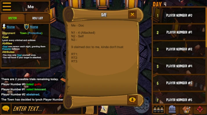 The day phase allows the Town members to discuss who they suspect of being an evil role. Once the voting phase starts a majority vote from the town will put someone on trial.