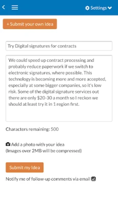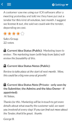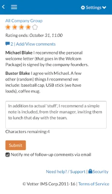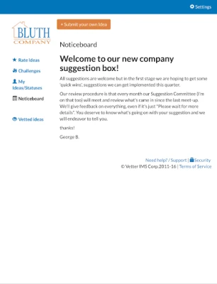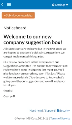 Vetter is an easy-to-use, easy-to-run online Employee Suggestion Box. Through the app, you can Submit Ideas, Rate Ideas and Comment on your colleagues' ideas.
