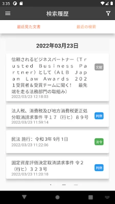 PC版「Westlaw Japan」の検索履歴とも自動的に同期するため、職場や自宅のPC上で調べた内容を外出先で効率よくチェックすることも可能です(本アプリにログイン後、最初の画面の「検索履歴」ボタンをクリックすると同期された履歴が表示されます)。